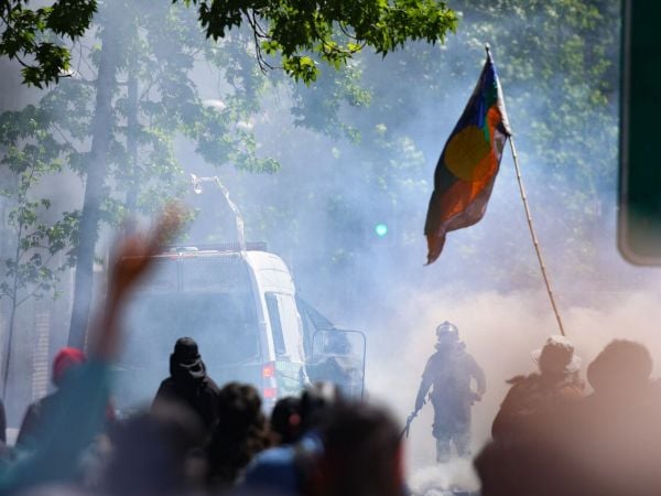 Si bien comenzó de forma pacífica, hubo otras personas ajenas a la marcha que -encapuchadas- se enfrentaron a personal de Carabineros, generándose diversos incidentes.