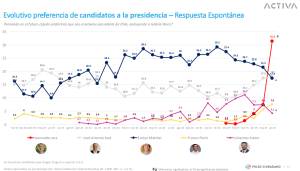 Por su parte, en la tercera posición quedó la abanderada de Chile Vamos, Evelyn Matthei, quien volvió a bajar y llegó al 17,4%.